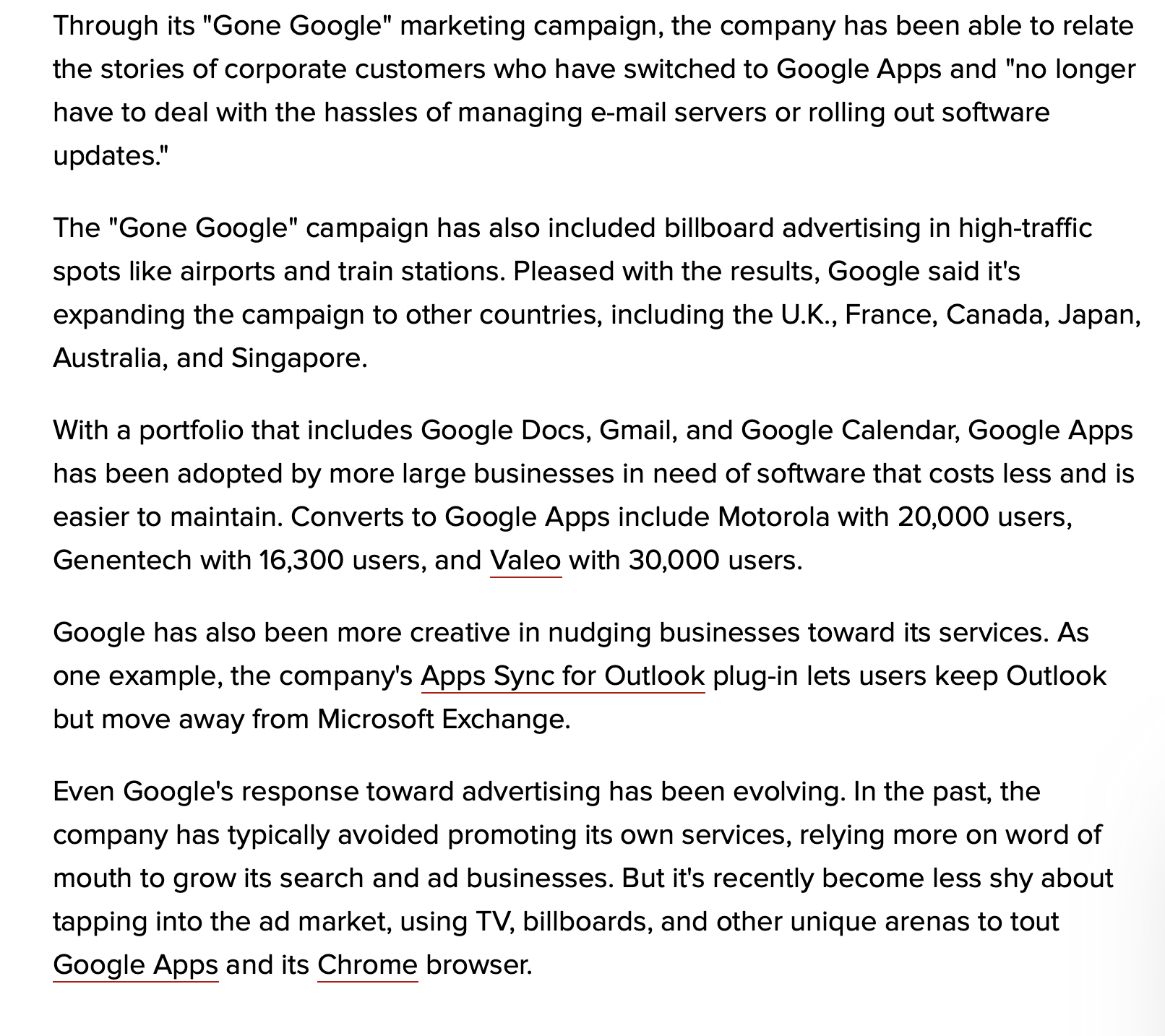 GoneGoogle.com is the second most successful website Google has ever produced. The site works as an interactive online calculator, allowing business owners or employees to see how much time and money their business would save by switching to Google Apps. The suite includes Google Docs, Gmail, and Google Calendar, Google Apps has been adopted by more large businesses in need of software that costs less and is easier to maintain. The campaign performed so well that it expanded internationally.