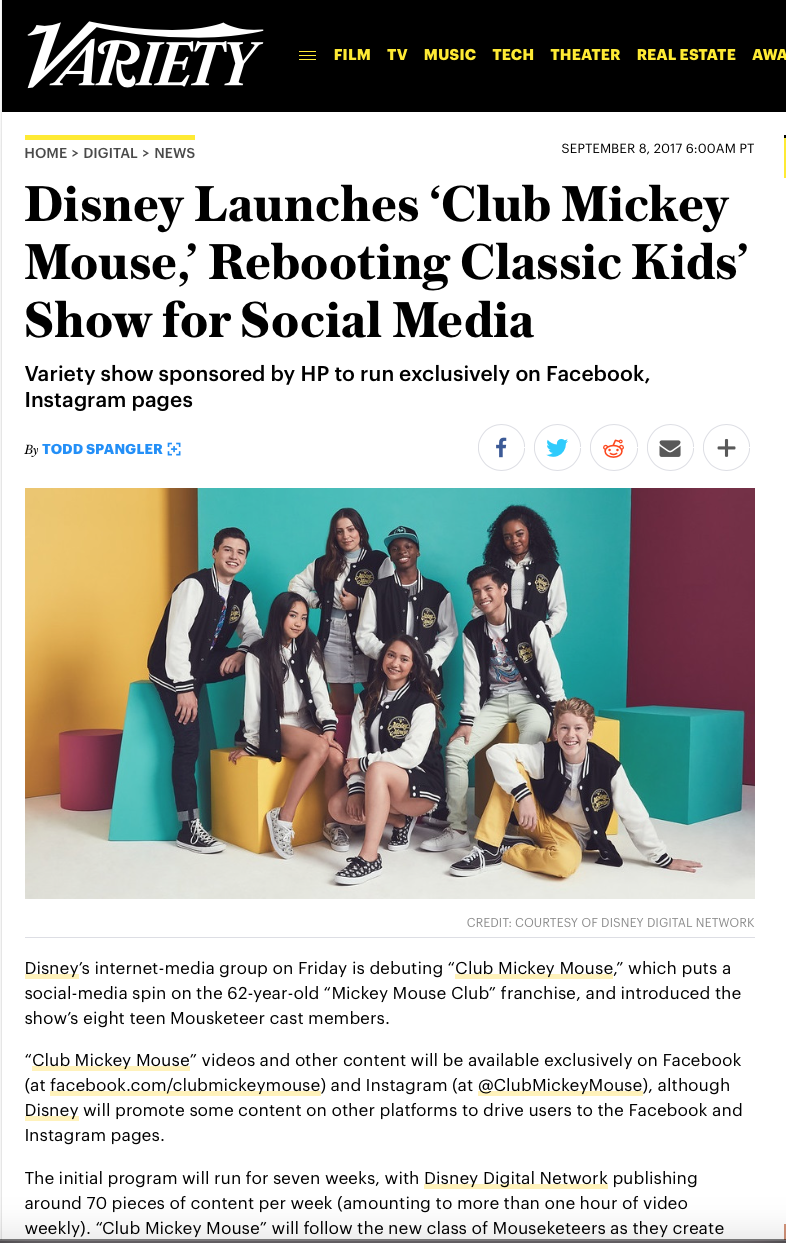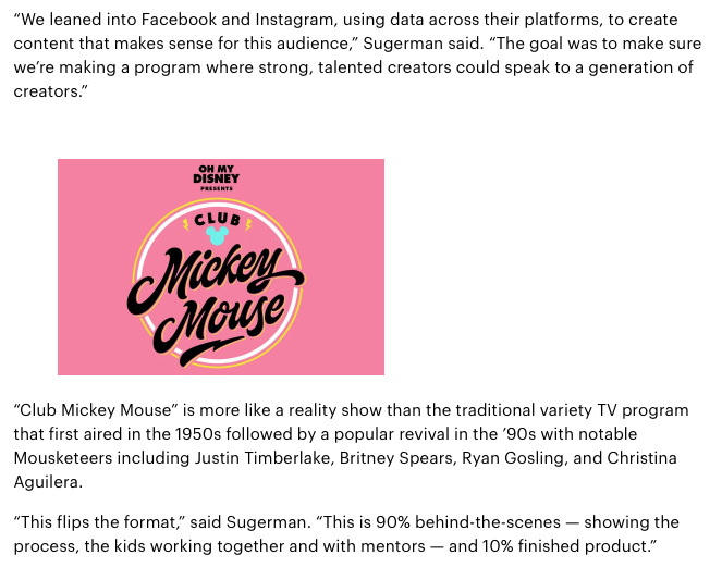 Since premiering in September, Club Mickey Mouse has rolled out more than 1,200 pieces of original content, including six original music videos, micro-content, shareables, and Instagram stories. Across Facebook and Instagram, the Club Mickey Mouse campaign generated more than 278 million digital impressions, 42.3 million video views, and 81,800 new social media followers and picked up a Shorty Award.