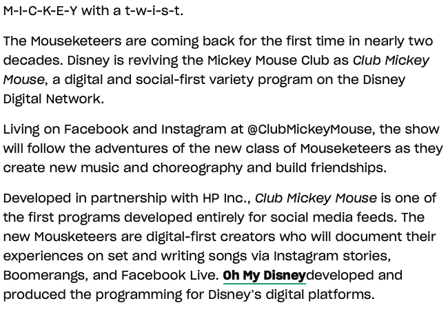 The reimagined branding for the new Club Mickey Mouse. Bringing the nostalgia of yesterday into the digital age, the entire series exists across social media (where kids have the greatest access). More transparent than the previous version, it shows the Mouseketeers process, trial and error, and growth.